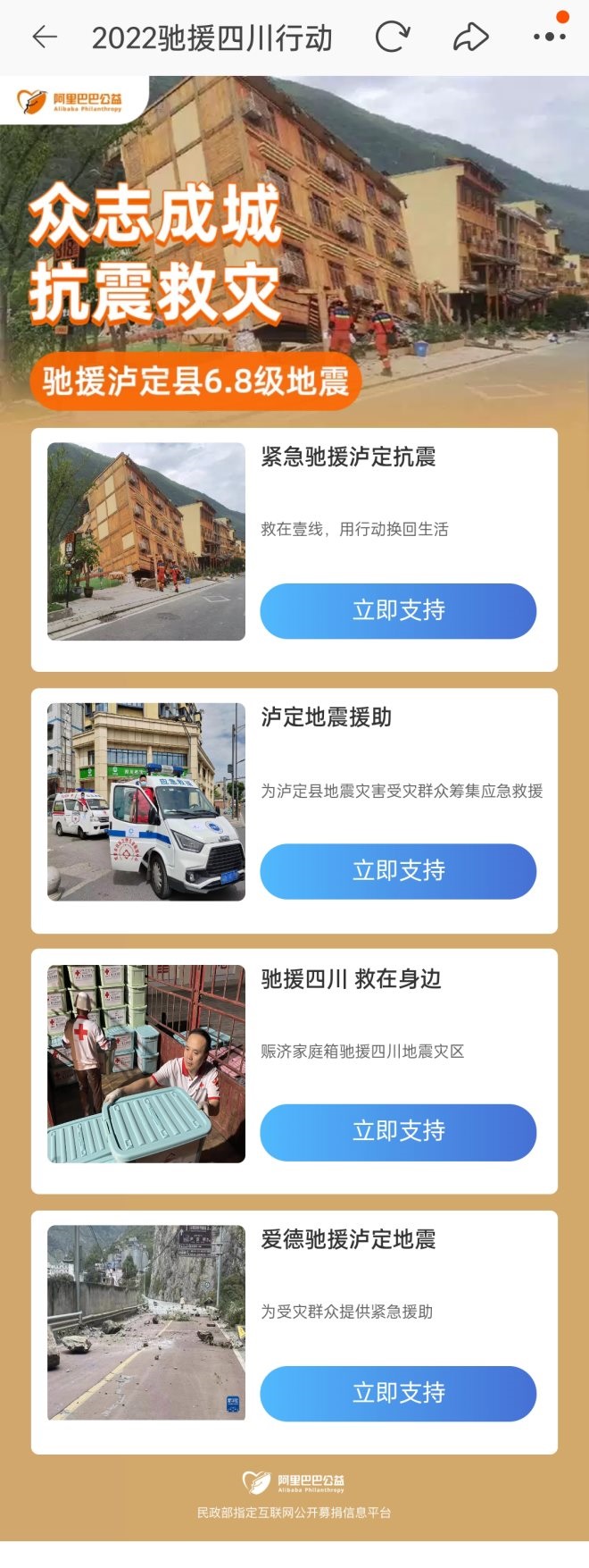 據(jù)悉,四川甘孜瀘定縣6.8級(jí)地震災(zāi)情牽動(dòng)全國(guó)人民的心,阿里巴巴公益基金會(huì)已迅速啟動(dòng)應(yīng)急救災(zāi)預(yù)案,并依照政府統(tǒng)一指揮,用于抗震救災(zāi)及災(zāi)后重建。