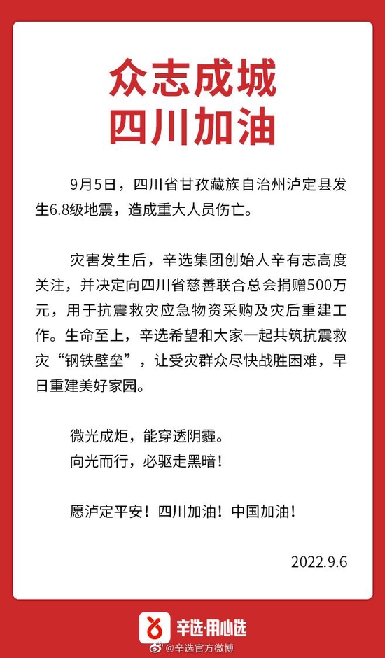 9月6日,辛選集團宣布向四川地震災區(qū)捐贈500萬元。