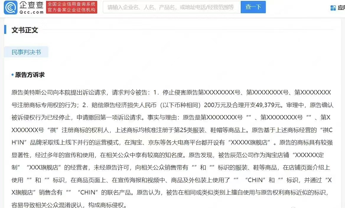 文書顯示,原告美特斯邦威公司訴稱,原告是多個(gè)“祺”商標(biāo)的權(quán)利人,基于此經(jīng)營(yíng)“祺CH’IN”品牌,被告辰范公司未經(jīng)許可在商品頁(yè)面、外包裝上等多處使用“CHIN”等標(biāo)識(shí),并銷售聯(lián)名產(chǎn)品,容易導(dǎo)致公眾混淆誤認(rèn),構(gòu)成商標(biāo)侵權(quán)。