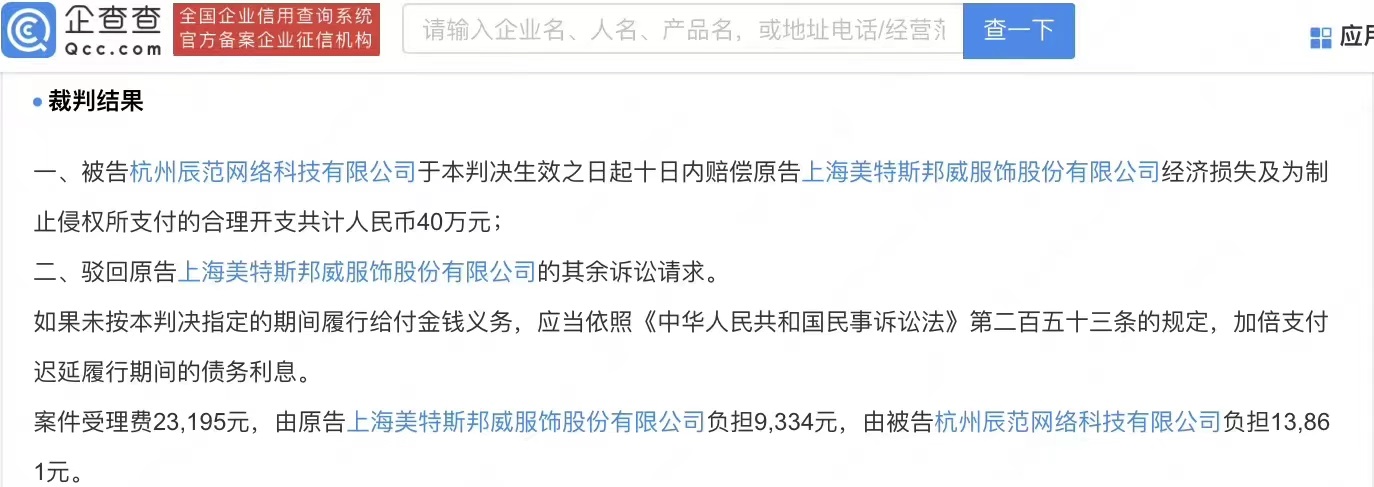 最終法院裁判結(jié)果為,被告辰范公司賠償原告美特斯邦威公司經(jīng)濟(jì)損失及為制止侵權(quán)所支付的合理開支共計(jì)人民幣40萬元。