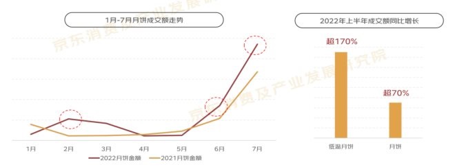 報(bào)告顯示,2022年上半年,月餅成交額同比增長(zhǎng)超70%,低溫月餅成交額同比增長(zhǎng)超170%。從2021年-2022年的前七個(gè)月月餅銷(xiāo)售走勢(shì)來(lái)看,今年整體月餅銷(xiāo)售更加日;,在過(guò)年聚會(huì)的2月、大促活動(dòng)的6月、家庭聚餐高峰的7月等都出現(xiàn)了相對(duì)的銷(xiāo)售高峰。