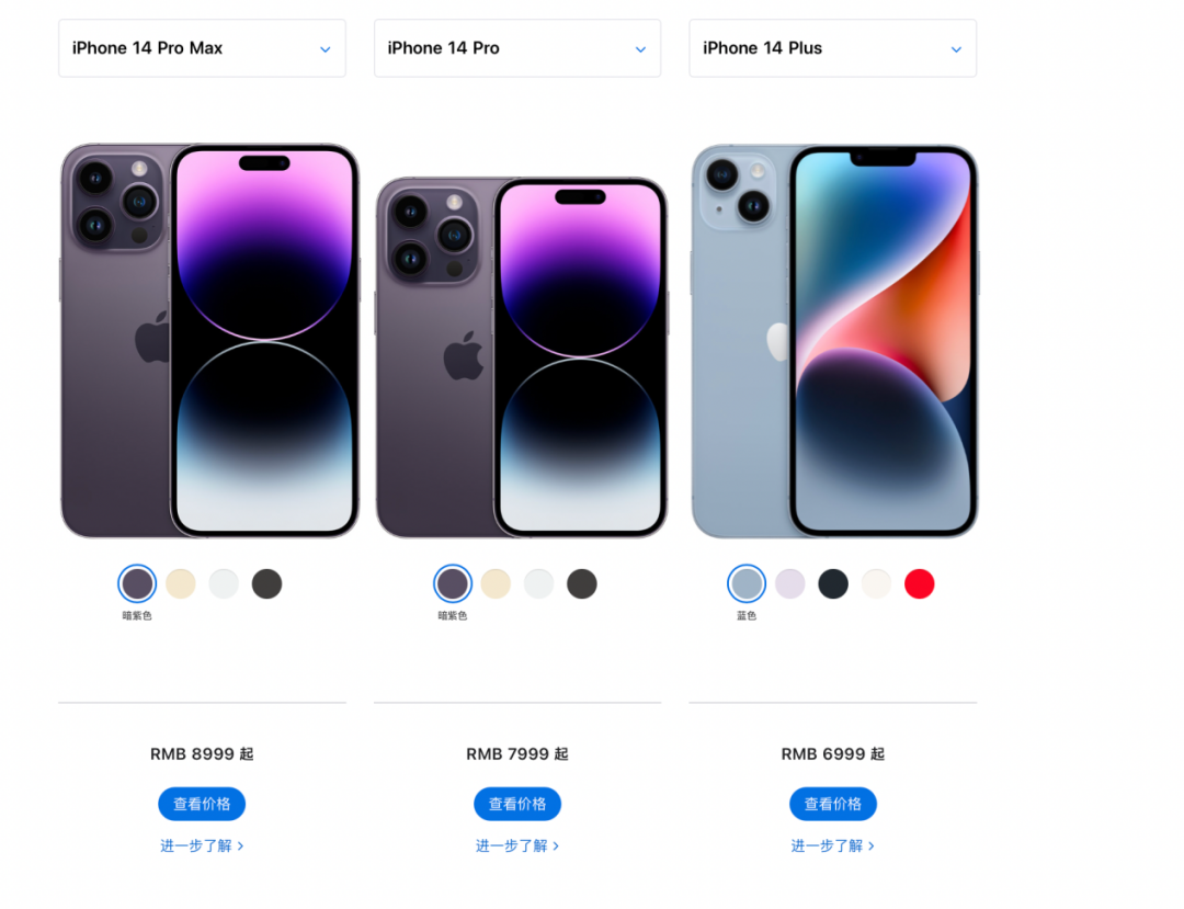 在大家最關(guān)心的價(jià)格方面,iPhone14首發(fā)價(jià)格保持不變,5999元人民幣起,iPhone14 Plus則為6999元人民幣起,iPhone 14 Pro和iPhone 14 Pro Max的起售價(jià)為7999和8999元。跟去年相比,不同內(nèi)存的iPhone14手機(jī)價(jià)格雖有小幅度上漲,但并非傳言那般,“iPhone14將是蘋果史上最貴一款手機(jī)”。