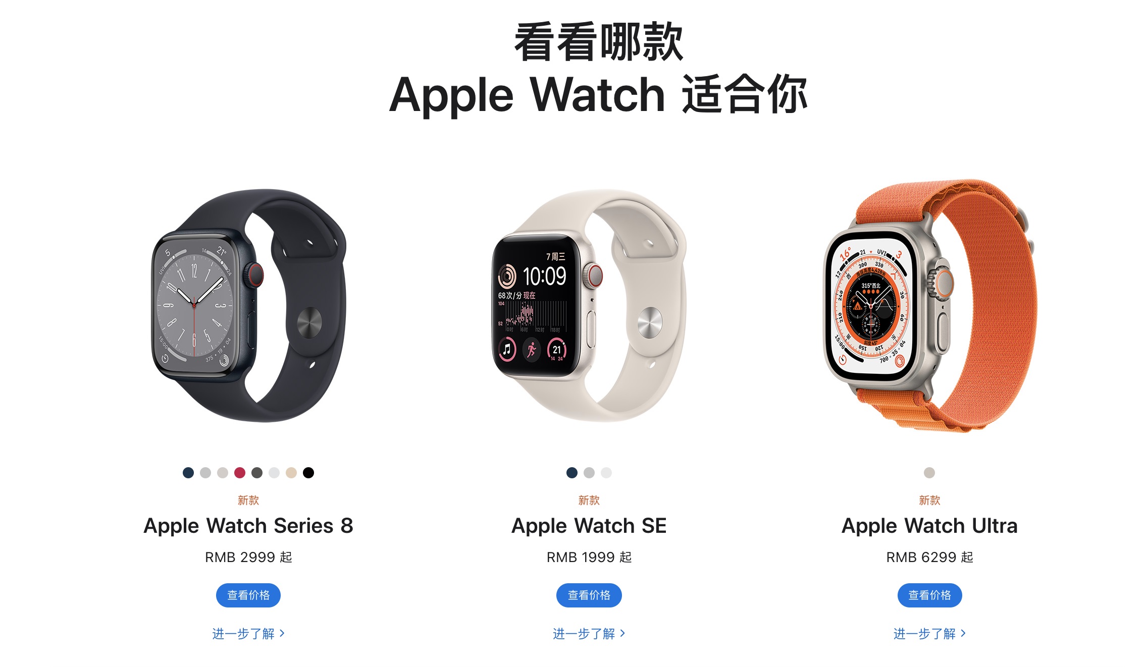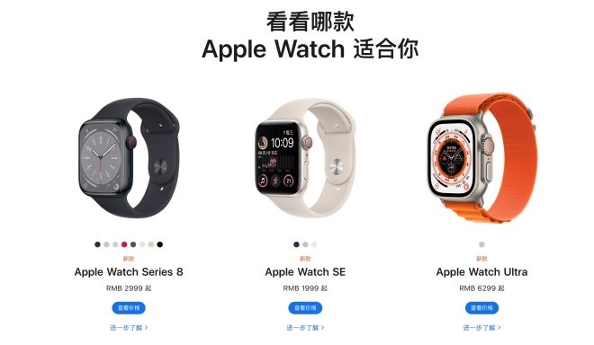 此外,蘋果還發(fā)布了三款智能手表系列Apple Watch Ultra、Apple Watch Series 8和Apple Watch SE,并公布國行版售價。Apple Watch Ultra于9月23日發(fā)售,起售價6299元;Apple Watch Series 8于9月16日發(fā)售,起售價2999元;Apple Watch SE于9月16日發(fā)售,起售價1999元。
