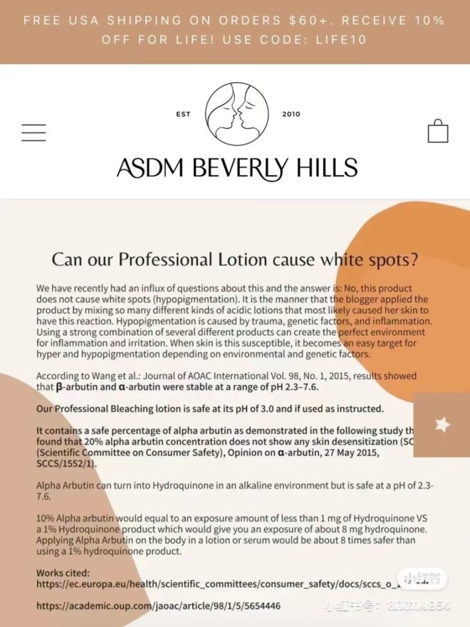 據(jù)了解,ASDM官網(wǎng)在該事件爆發(fā)后曾發(fā)布一則澄清公告,否認(rèn)產(chǎn)品會(huì)導(dǎo)致白斑,認(rèn)為是該博主混合不同種類的酸性乳液,才可能導(dǎo)致皮膚產(chǎn)生白斑反應(yīng)。ASDM官方還在說(shuō)明中提到α-熊果苷只會(huì)在堿性環(huán)境中轉(zhuǎn)化為對(duì)苯二酚,也就是氫醌,但在pH2.3-7.6范圍內(nèi)是穩(wěn)定的,而ASDM的身體乳產(chǎn)品的pH值為3.0。