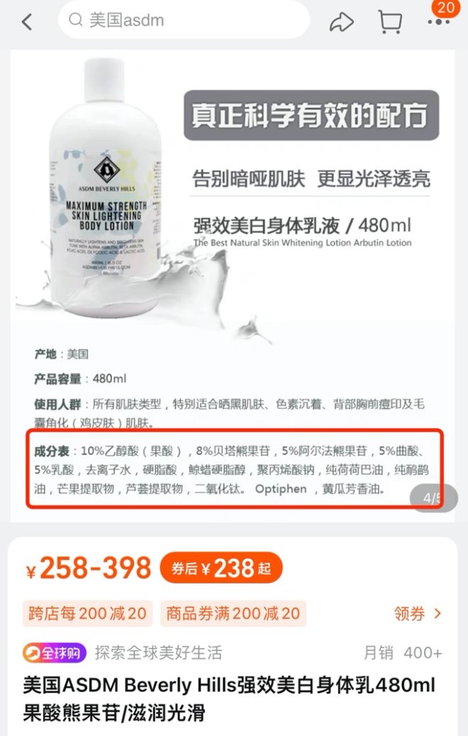 青眼了解到,ASDM身體乳目前共有4種不同版本,其中包括官網(wǎng)在售的含有10%α-熊果苷、3%曲酸等成分的身體乳“小粉瓶”,含有2%α-熊果苷、2%β-熊果苷、2%曲酸的“小藍(lán)瓶”,和10%α-熊果苷、15% 乙醇酸的“美白凝膠”3款產(chǎn)品,以及一款已于2018年10月官網(wǎng)停產(chǎn)下架的10%乙醇酸、8%β-熊果苷、5%α-熊果苷、5% 曲酸、5%乳酸的“舊版小藍(lán)瓶”。
