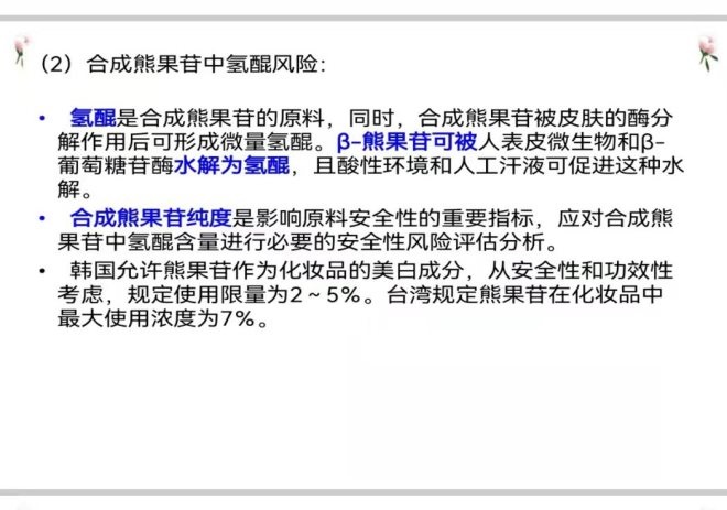 據(jù)悉,出于安全考慮,韓國(guó)允許熊果苷作為化妝品美白成分的規(guī)定使用限量為2-5%。而值得注意的是,除了歐盟,越南近期也宣布考慮到使用過(guò)程中可能釋放出氫醌,將在化妝品中禁用脫氧熊果苷。