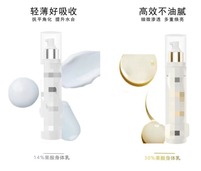 而上述美妝博主推薦的“美白混合法”給ASDM身體乳搭配的無(wú)一不是含有高濃度果酸的產(chǎn)品,最高果酸濃度高達(dá)30%。