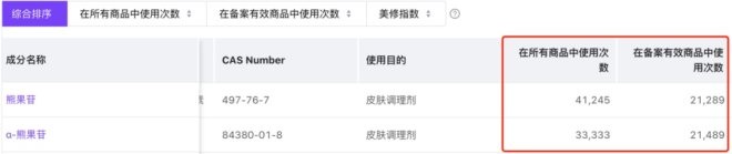 目前,熊果苷在化妝品中屬于常見美白成分。有數(shù)據(jù)顯示,截止發(fā)稿在備案有效商品中使用次數(shù)為21289次,α-熊果苷為21489次,僅這一個(gè)月就增長(zhǎng)了近700次。顯而易見,如今α-熊果苷的勢(shì)頭已經(jīng)超過(guò)熊果苷。