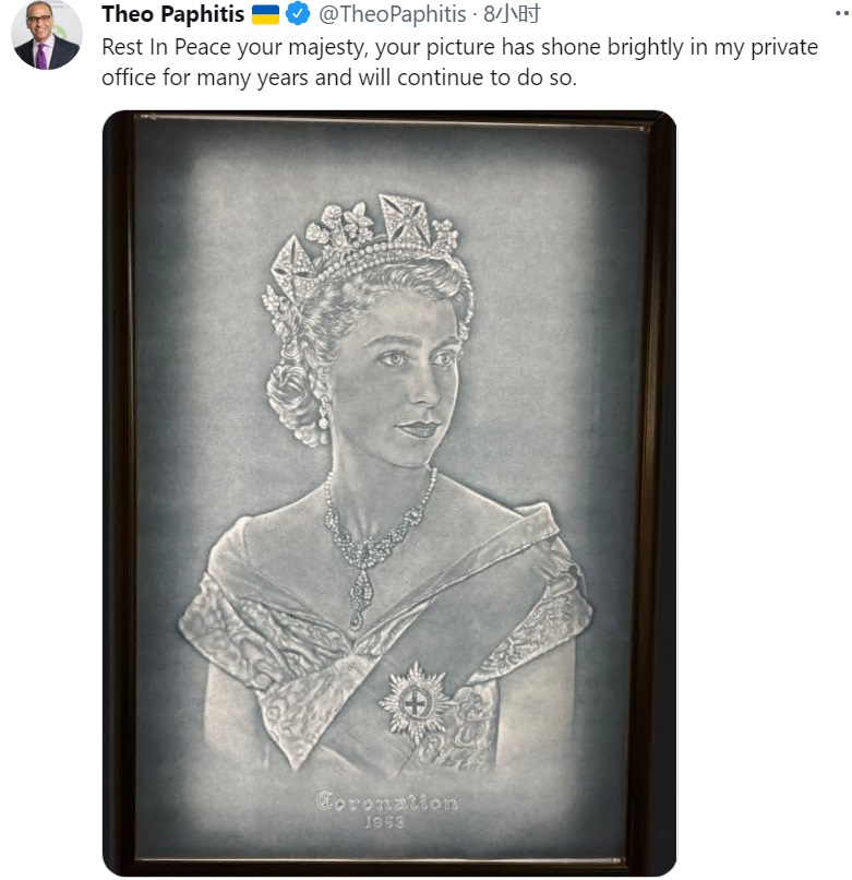Paphitis隨后在推特上發(fā)了一張女王的照片,并補(bǔ)充說:“您的照片多年來一直在我的私人辦公室內(nèi)熠熠生輝,未來它也會一直在這里!