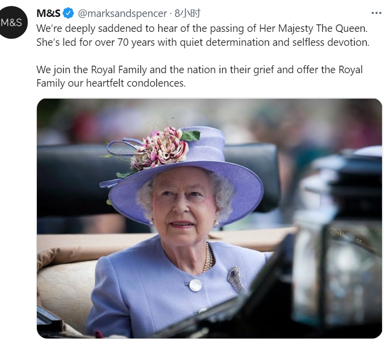 Marks & Spencer馬莎百貨在推特上寫道:“聽聞女王陛下去世的消息后我們深感悲痛。她以堅定的決心和無私的奉獻(xiàn)精神領(lǐng)導(dǎo)了我們 70 多年。我們與王室和國家一起悲痛,并向王室表最誠摯的哀悼!