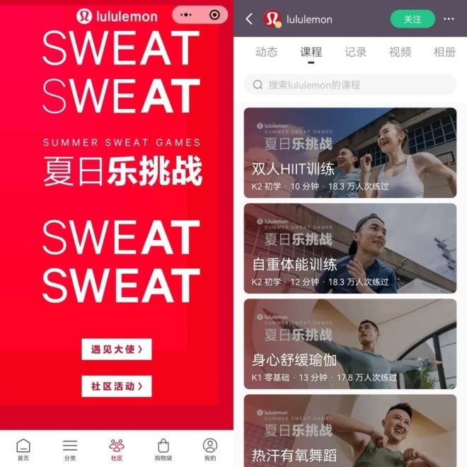 lululemon在微信端的線上經(jīng)營(yíng)更加具有代表性。其微信公眾號(hào)與微信商城、線下門店、視頻號(hào)和小程序互通,公眾號(hào)是主體,商城實(shí)現(xiàn)線上購(gòu)物,線下門店可以讓消費(fèi)者進(jìn)行線下體驗(yàn),視頻號(hào)進(jìn)行短視頻內(nèi)容種草,小程序則能完成熱汗社區(qū)活動(dòng)的報(bào)名。