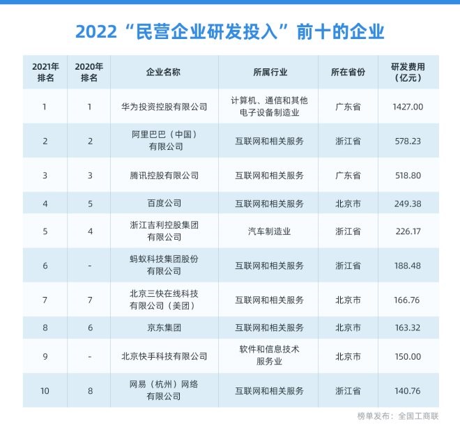 阿里、螞蟻、美團等上榜2022民營企業(yè)研發(fā)投入十強