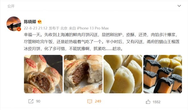 ▲8月23日,陳曉卿導(dǎo)演發(fā)布了一則關(guān)于鮮肉月餅的微博。圖源:微博