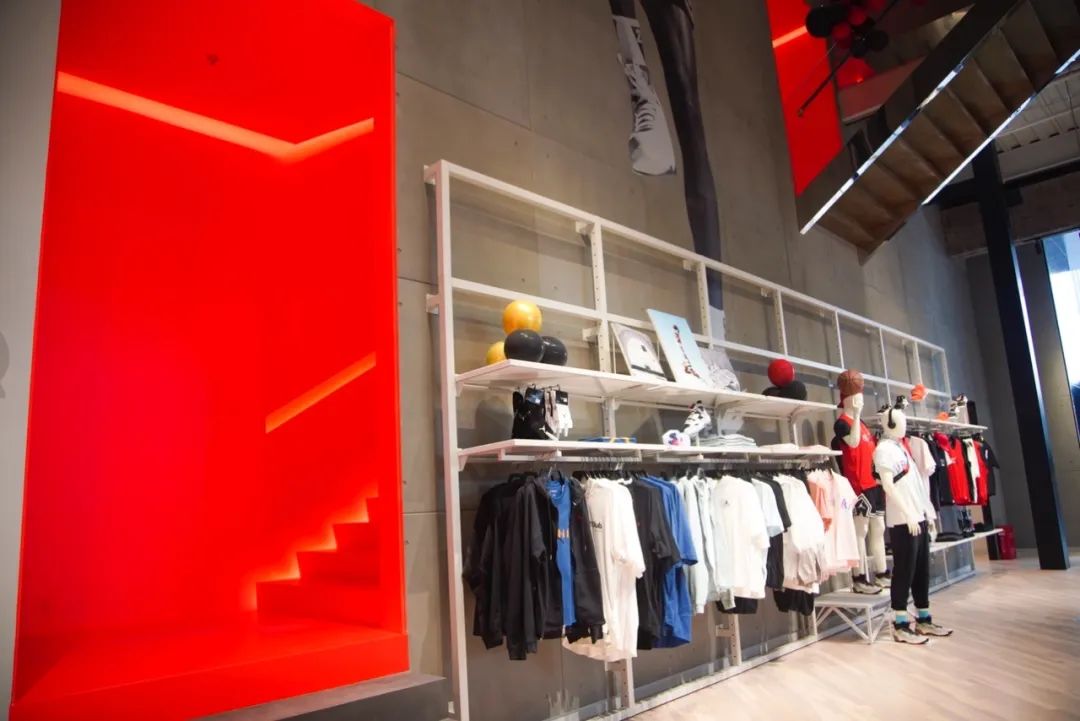 南京中央商場(chǎng)Jordan店鋪以高級(jí)灰為主色調(diào),輔以經(jīng)典的黑紅配色,隱藏的樓梯連廊通體AJ紅色,兼具未來主義及科技感;疑膲γ嫔,巨幅邁克爾·喬丹畫像一躍而起,重現(xiàn)經(jīng)典“飛翔”時(shí)刻。