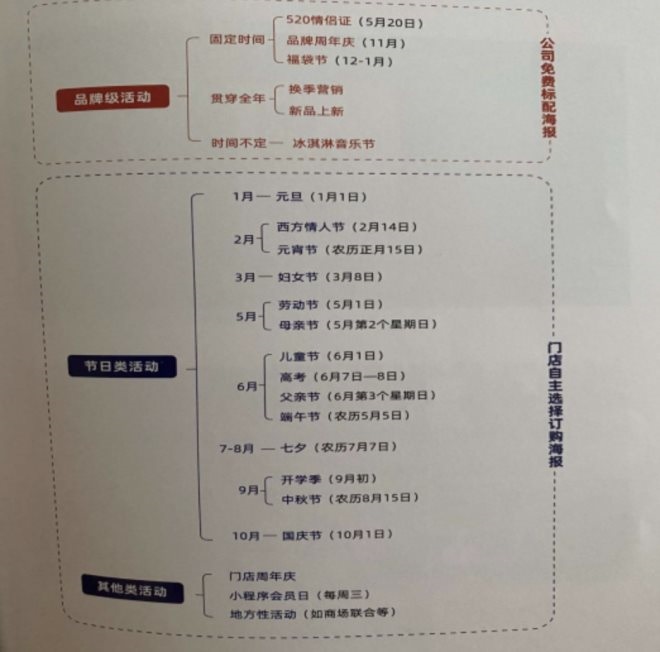 除了產(chǎn)品營(yíng)銷日歷,還有全年?duì)I銷日歷,門店一年什么時(shí)候可做哪些活動(dòng),事先已經(jīng)規(guī)劃好,門店經(jīng)營(yíng)者一目了然,心中有數(shù)。各類活動(dòng)的流程都相對(duì)固定,每一個(gè)節(jié)日具體的活動(dòng)形式與策略都會(huì)提前知會(huì)門店。