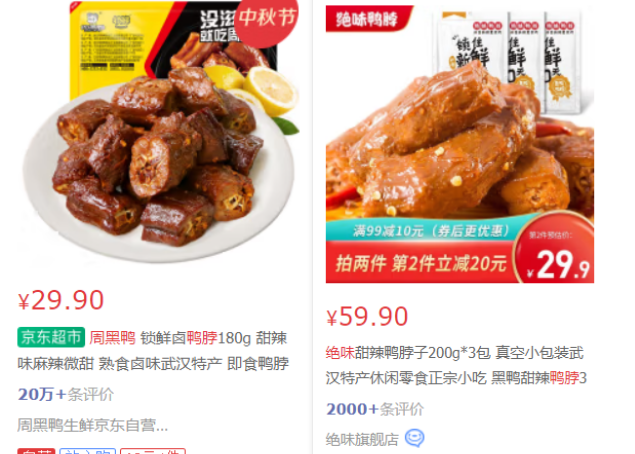以鴨脖為例,在京東平臺(tái)上,周黑鴨180g鎖鮮鹵鴨脖甜辣味價(jià)格為29.90元,而絕味甜辣味鴨脖,200g*3包的價(jià)格為59.9元,在相同克重下,前者高于后者。