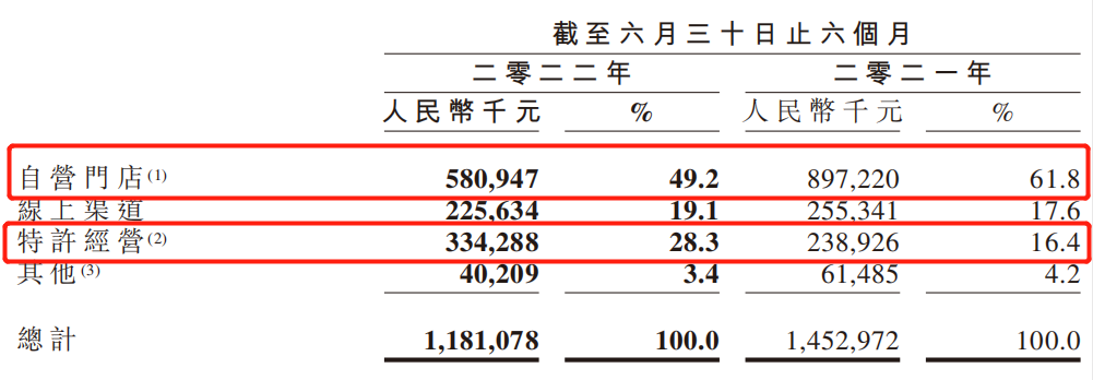 其中,來(lái)自于自營(yíng)門(mén)店的收入貢獻(xiàn)為5.8億元,在整體營(yíng)收中占比為49.2%,而2021年同期來(lái)自于自營(yíng)門(mén)店的收入占比為61.8%。