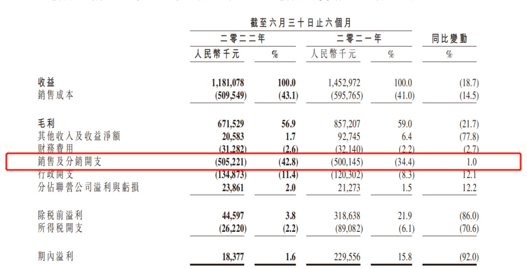 在營(yíng)收和凈利潤(rùn)出現(xiàn)下滑的同時(shí),財(cái)報(bào)中銷(xiāo)售及分銷(xiāo)開(kāi)支還出現(xiàn)了上漲,財(cái)報(bào)顯示,2022年上半年銷(xiāo)售及分銷(xiāo)開(kāi)支為5.05億元,同比增長(zhǎng)1%,對(duì)于增長(zhǎng)的原因,周黑鴨方面則表示,主要是由于銷(xiāo)售人員薪金福利以及由于地域擴(kuò)張產(chǎn)生的運(yùn)輸開(kāi)支增加。