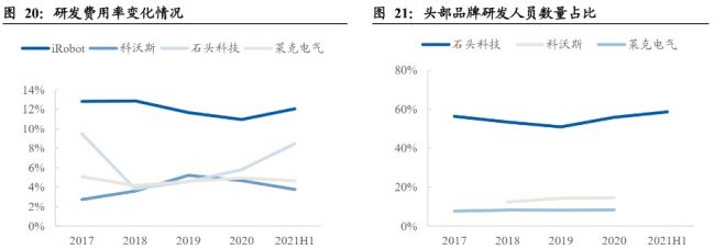 但國內(nèi)掃地機(jī)器人企業(yè),研發(fā)投入占總營收比顯得不盡人意。反觀國內(nèi)玩家對(duì)標(biāo)的iRobot,從2013年至今,其研發(fā)費(fèi)用占比就一直穩(wěn)定在10%以上。