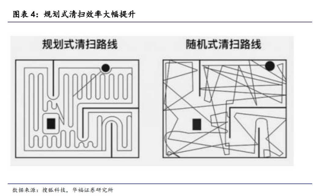掃地機(jī)器人清掃路線對(duì)比,圖源華福證券《掃地機(jī)器人行業(yè)深度報(bào)告》