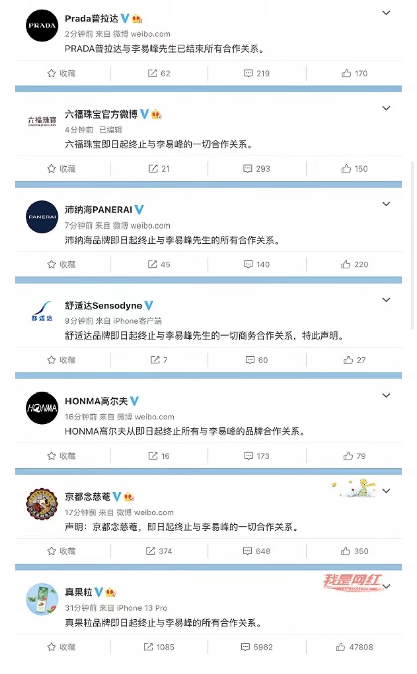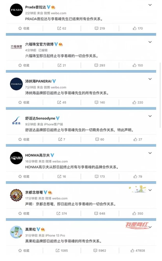 隨后,Prada普拉達(dá)、六福珠寶、沛納海、舒適達(dá)、HONMA、京都念慈庵、真果粒等多家品牌宣布與李易峰終止合作關(guān)系。