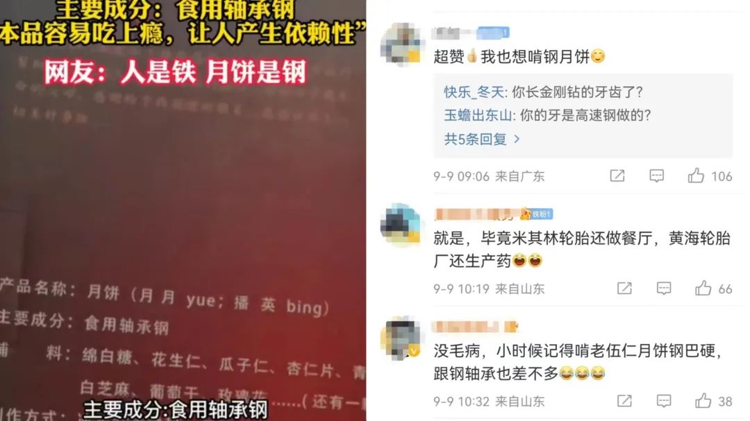 山東一女子在網(wǎng)上發(fā)出了公司的“硬核”月餅,主要成分一欄赫然寫著“食用軸承鋼”。制作方式為“沖壓鍛造成型、低溫猝火”,不良反應“本產(chǎn)品容易吃上癮”。
