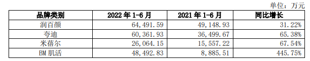 除了有穩(wěn)定的客戶之外,華熙生物的盈利“秘笈”來(lái)自它的功能性護(hù)膚品業(yè)務(wù)。華熙生物2022上半年的營(yíng)收為29.35億元,位于上海家化的后面,在本次營(yíng)收統(tǒng)計(jì)中排名第二。其中,有21.27 億元的收入來(lái)自旗下潤(rùn)百顏、夸迪、米蓓爾以及BM肌活,同比增長(zhǎng) 77.17%。