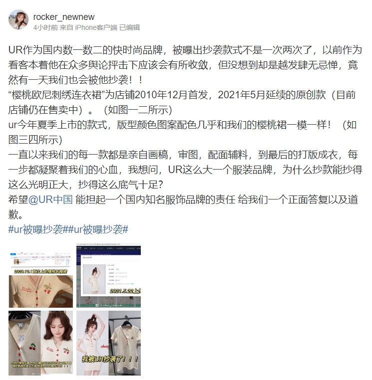 9月12日,在事件發(fā)酵引起關(guān)注后,另一博主也發(fā)文表示有被UR抄襲的類似經(jīng)歷,希望能得到一個正面答復(fù)。