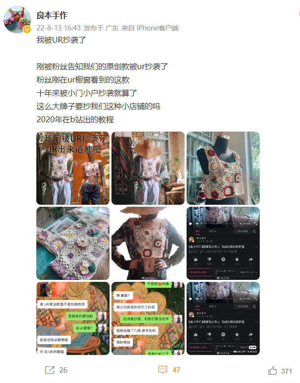 日前,博主良本手作發(fā)帖爆料知名快時尚品牌UR抄襲自家原創(chuàng)作品。