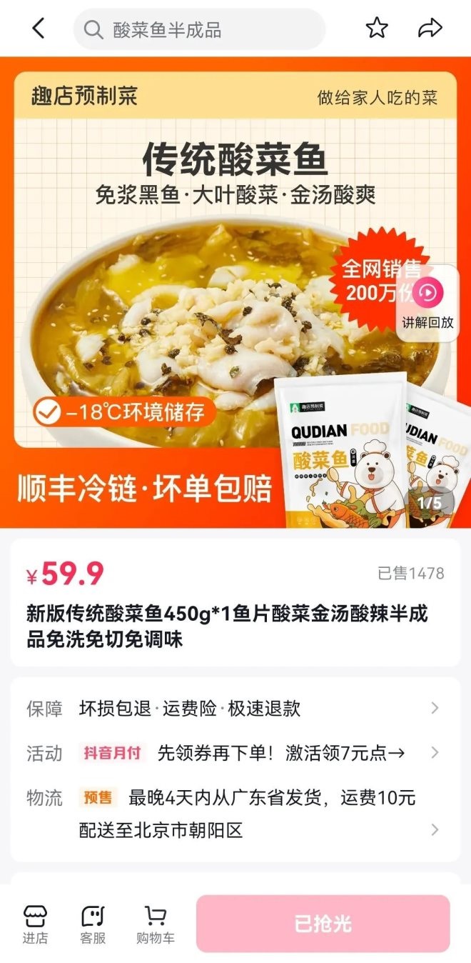 但是,目前在趣店抖音旗艦店上共有15款預(yù)制菜產(chǎn)品,所有產(chǎn)品購(gòu)買頁(yè)面均顯示“已搶光”。