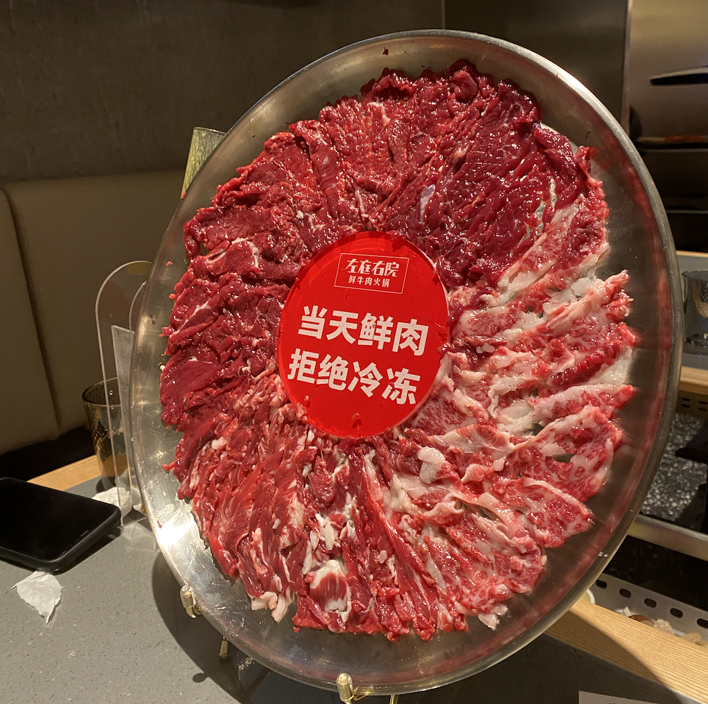 在鮮牛肉火鍋品牌左庭右院開在上海的牧場主題店,內參君體驗到了豎放的牛肉拼盤,與平鋪相比,這種擺盤更具新意,更有沖擊力,也更能讓消費者體會到牛肉的新鮮品質。