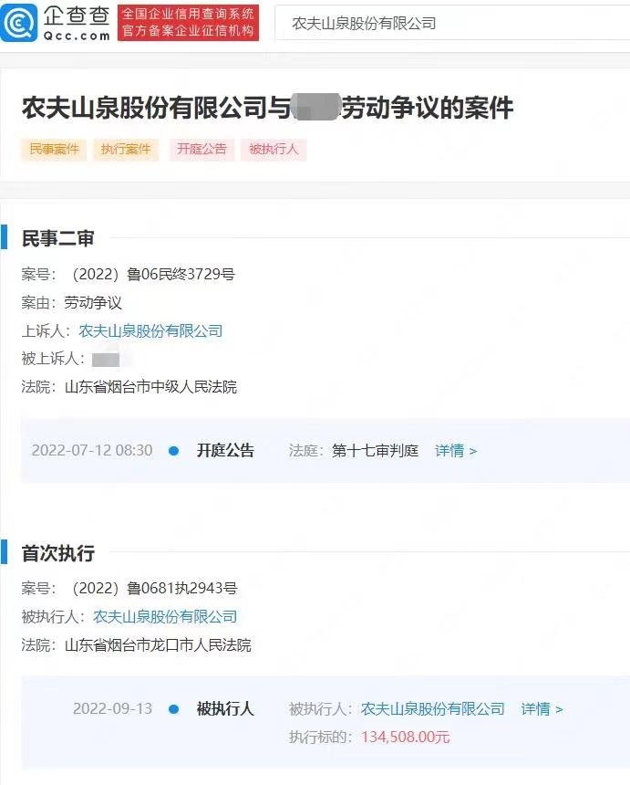 企查查APP顯示,9月13日,農夫山泉股份有限公司被山東省煙臺市龍口市人民法院列為被執(zhí)行人,執(zhí)行標的約13.45萬元,案號(2022)魯0681執(zhí)2943號,關聯(lián)案件涉及勞動爭議。