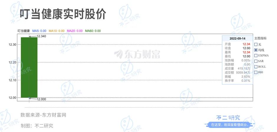 叮當健康發(fā)行價為12.00港元/股,開盤價為12.34港元/股,較發(fā)行價上漲2.83%;截至9月14日港股收盤,叮當健康平收12港元/股,對應市值161億港元(市值折合人民幣142億元)。