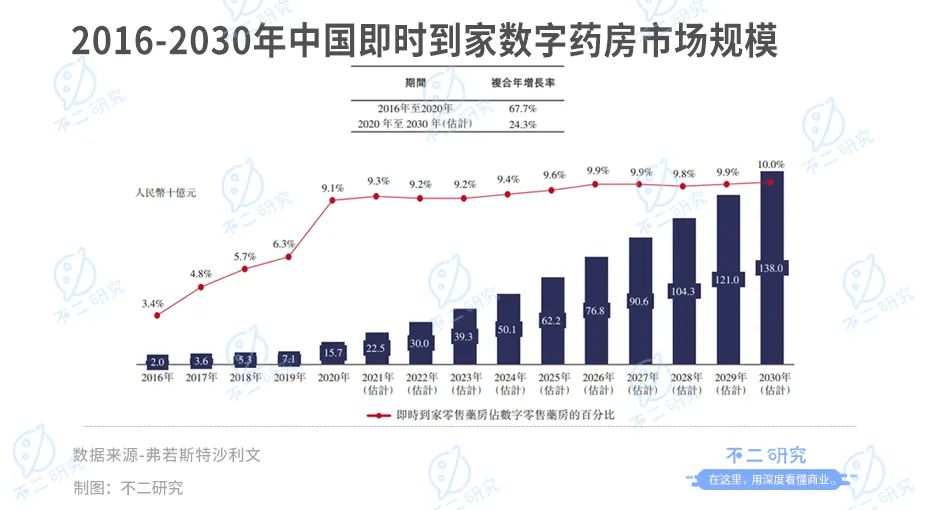 據弗若斯特沙利文報告,2016年至2020年,即時到家數字藥房市場以67.7%的復合年增長率自2016年的20億元開始大幅增長,預計2030年將達到1380億元,復合年增長率為24.3%。此外,預計數字零售藥房市場上的即時到家數字藥房的占比將從2020年的9.15%增加至2030年 的10.0%。