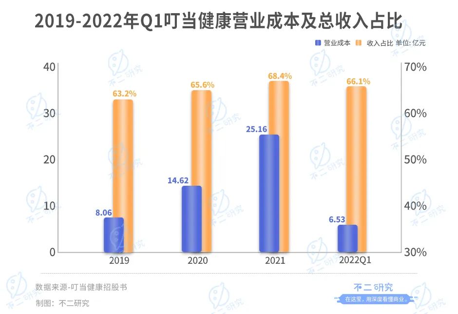據招股書顯示,2019-2021年及2022年一季度,叮當健康的營業(yè)成本分別為8.06億、14.62億、25.16億和6.53億元,占總收入的63.2%、65.6%、68.4%和66.1%。