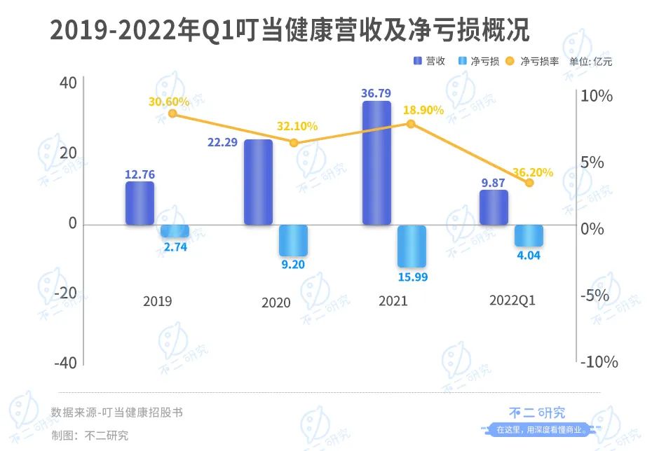 據招股書顯示,2019-2021年及2022年一季度,叮當健康的收入分別為12.76億、22.29億、36.79億和9.87億元,據此前招股書顯示,2018年的收入為5.85億元,可以得出其同期營收同比增速分別為118.2%、74.7%、65.1%和68.90%。