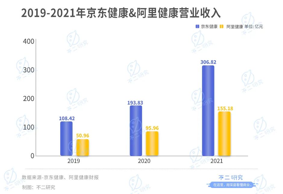 據此前京東健康財報顯示,2019-2021年,其收入分別為108.42億、193.83億和306.82億。同期,阿里健康財報顯示,其收入分別為50.96億、95.96億和155.18億。