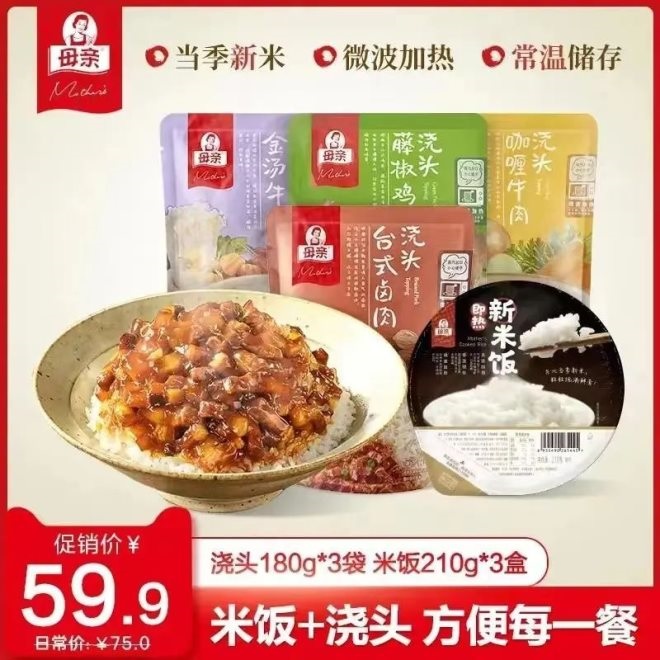飲用水巨頭農(nóng)夫山泉也同樣看到了機(jī)會(huì)。依托母公司旗下子品牌“母親”推出即熱米飯,配合此前其曾推出過(guò)的即食澆頭產(chǎn)品,以蓋澆飯預(yù)制菜的形式切入賽道。