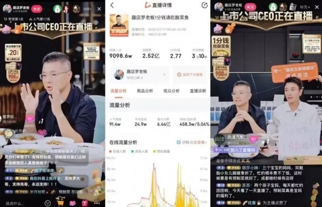 同樣“高舉高打”的趣店創(chuàng)始人羅敏,6月宣布進(jìn)軍預(yù)制菜,7月在抖音直播間高調(diào)賣預(yù)制菜,單場(chǎng)長(zhǎng)達(dá)19個(gè)小時(shí),觀看人次達(dá)9587萬(wàn),單日累計(jì)銷量956萬(wàn)份,拿下2.5億GMV,次日股價(jià)開(kāi)盤大漲60%。