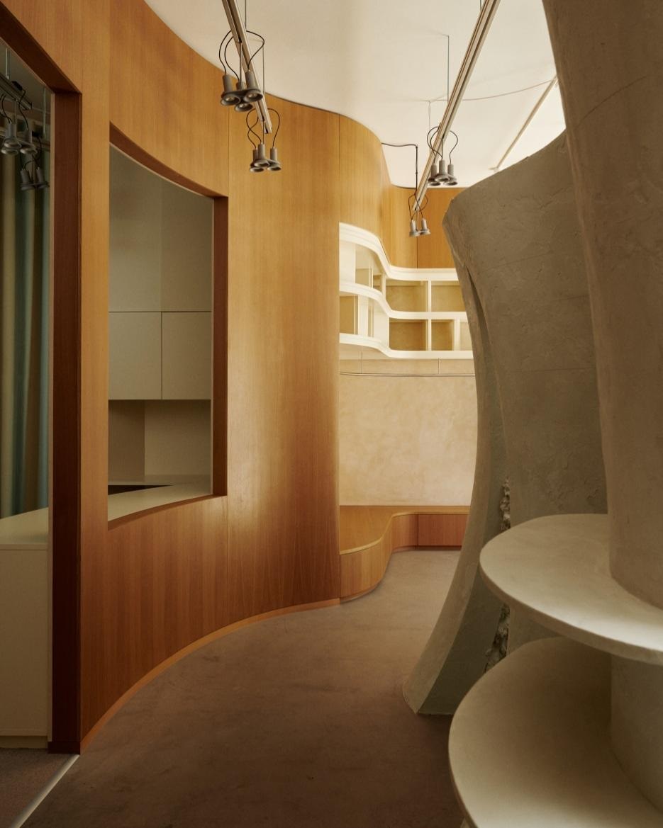 一尊引人注目的手工泥塑,引導(dǎo)人們的視線停留在服裝和物件架上。在與挪威藝術(shù)家Ingeborg Riseng的合作下,雕塑獨特的粘土狀與中性彎曲橡木貼面架并列,激發(fā)好奇心的設(shè)計吸引了游客和路人的注意。