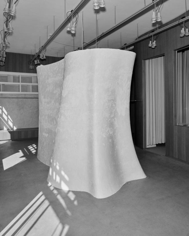 在一個旋轉(zhuǎn)的聲音裝置中暫停片刻后反射的雕塑,將“痕跡”描繪出一種超越傳統(tǒng)零售店快速體驗的新風(fēng)向。與哥本哈根藝術(shù)家Tronjhem Ronhem合作定制的印花試衣間窗簾上,演繹出挪威天空的光線。從試衣間里仔細(xì)地審視,會發(fā)現(xiàn)光線的顏色和明暗是流動而變化的。