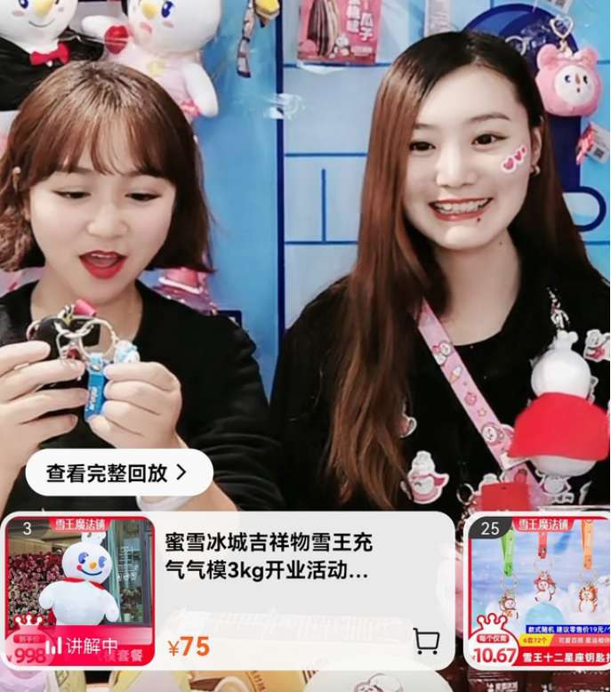 在飲品之外,蜜雪冰城還玩起了電商。從2021年開始,蜜雪冰城著手培養(yǎng)自己的主播,基于雪王IP,打造了三款零售產(chǎn)品線,包括花果茶、小零食、杯子,以及“雪王”IP衍生出的盲盒、徽章等文創(chuàng)周邊。