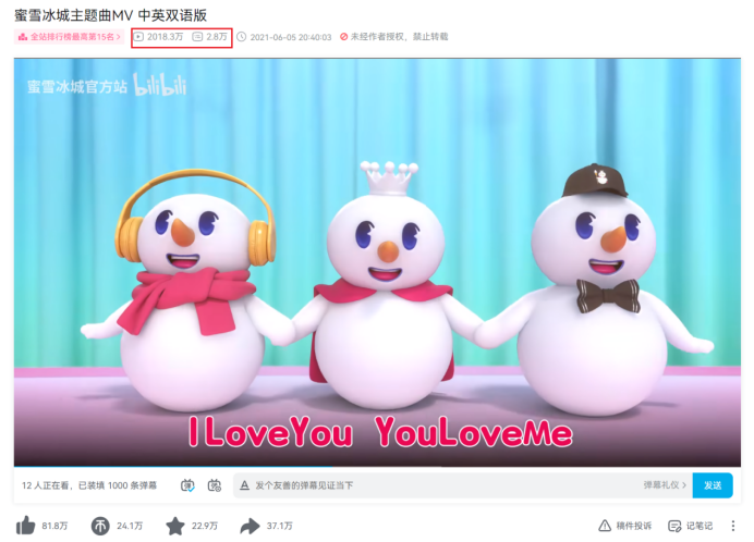 同年6月,蜜雪冰城品牌官方號在B站上傳了主題曲MV《你愛我,我愛你,蜜雪冰城甜蜜蜜》,隨后又上傳了中英雙語版,魔性的旋律和簡單的歌詞,讓這首主題曲迅速火遍全網(wǎng)。
