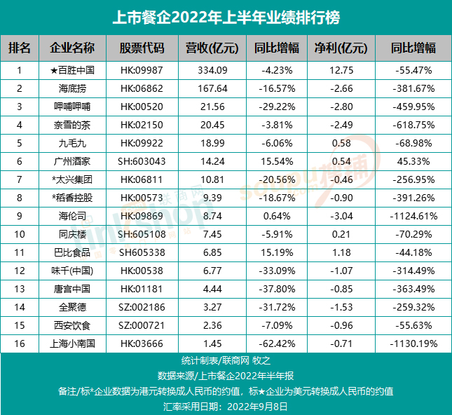 據(jù)聯(lián)商網(wǎng)零售研究中心統(tǒng)計,2022年上半年,16家上市餐企僅有廣州酒家、海倫司和巴比食品等3家企業(yè)實(shí)現(xiàn)營收同比增長,其余13家餐企均實(shí)現(xiàn)營收同比下滑,上海小南國下滑幅度最大,同比下降62.42%。