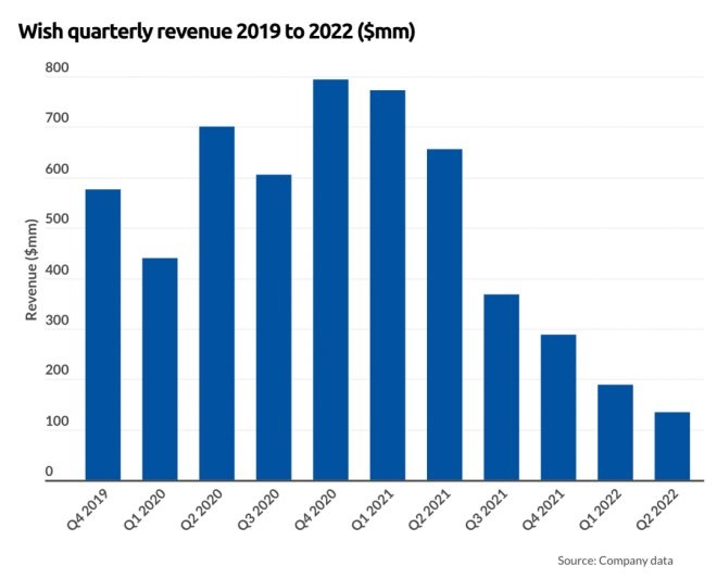 公司財(cái)報(bào)顯示,Wish的營(yíng)收在2021年下跌20.7%,整整六個(gè)季度(從2021Q1到2022年Q2)營(yíng)收呈現(xiàn)持續(xù)下降趨勢(shì)。與營(yíng)收下滑相伴而來(lái)的還有月活用戶的萎縮。與2020年四個(gè)季度月活用戶人數(shù)均超過(guò)1億相比,2022年月活用戶數(shù)量已大跌至2700萬(wàn)。