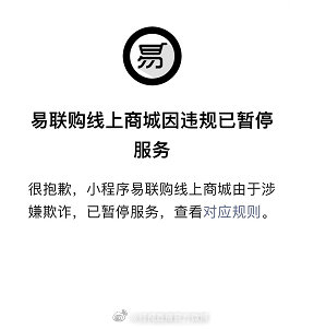 該聲明存在多處錯別字,真假存疑,目前在支付寶和微信平臺,”易聯(lián)購“賬號已經(jīng)被關(guān)閉,微信頁面顯示“由于涉嫌欺詐,已暫停服務(wù)””優(yōu)樂購機“微信公眾號和小程序仍然在,客服仍然在線,并且辟謠希望大家”理性吃瓜“。