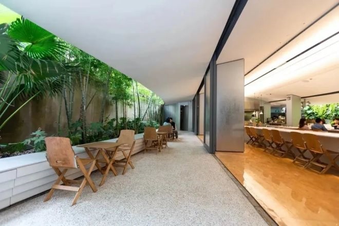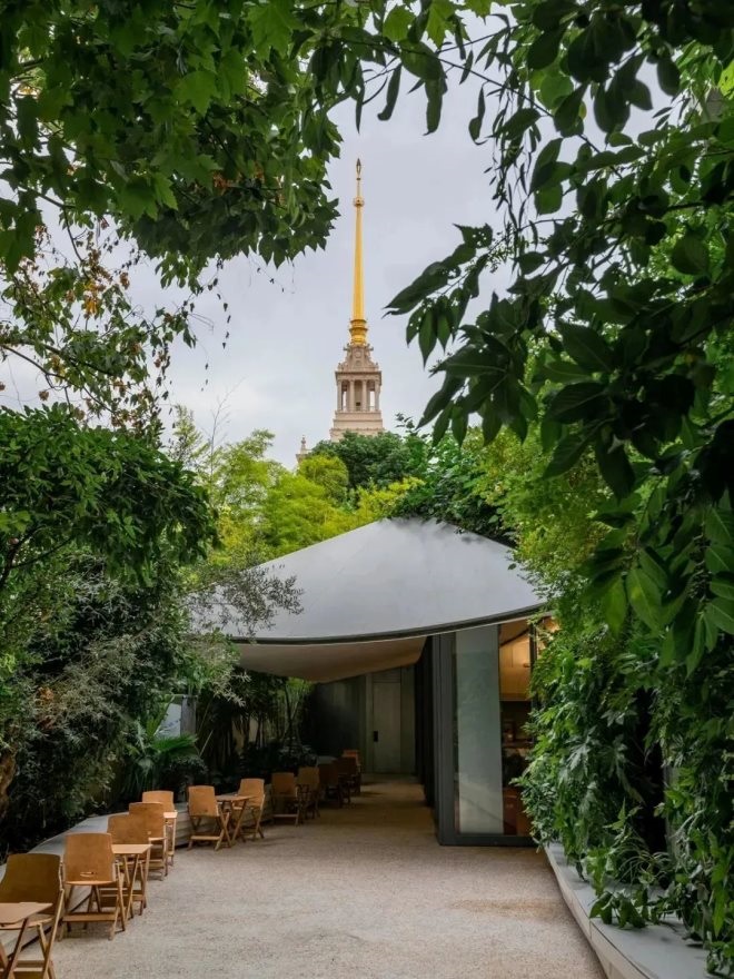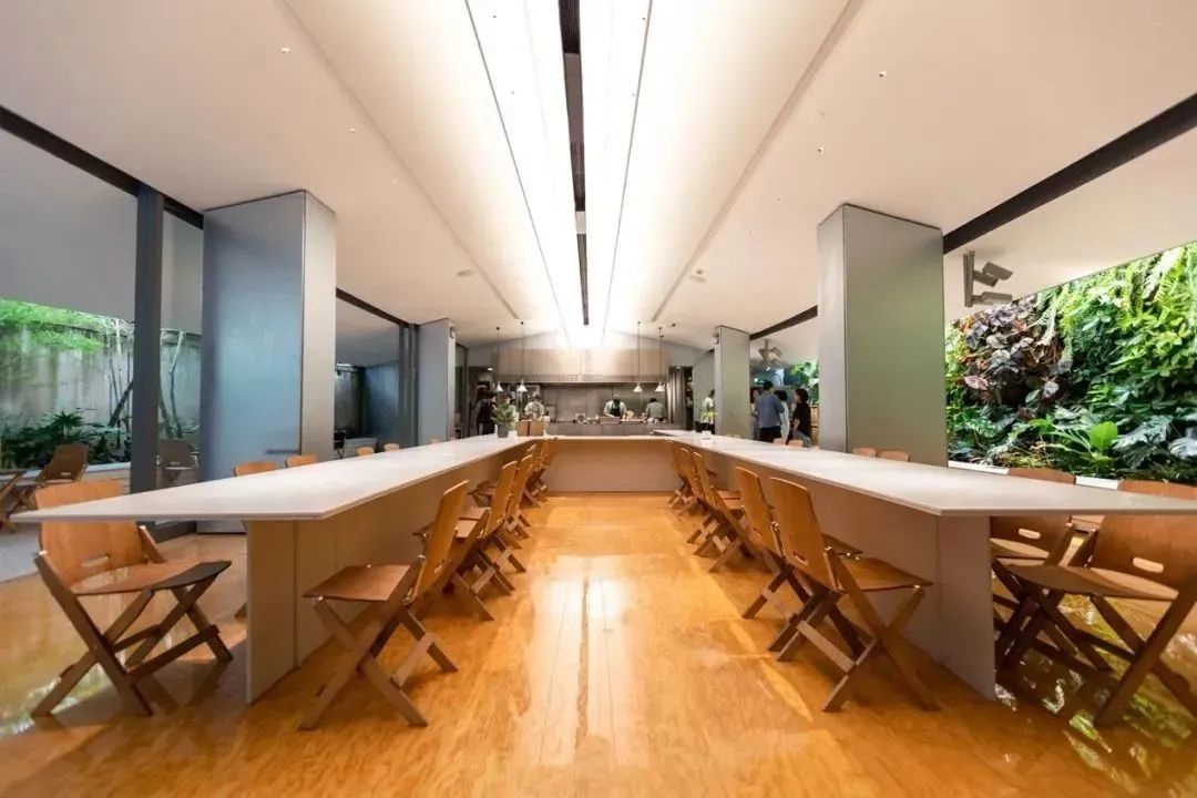 門店極大發(fā)揮院落式環(huán)境形成輕盈舒展、充滿生機(jī)的就餐氛圍,上海展覽中心建筑物和院內(nèi)植物相互映襯。
