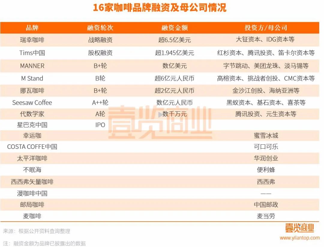另外,在一級市場方面,從已披露出來的融資金額來看,Tims中國咖啡、MANNER和M Stand三個品牌獲得的融資金額最高,分別有超1.945億美元、數(shù)億美元和超6億元人民幣;挪瓦咖啡、Seesaw Coffee有超2億元、數(shù)億元人民幣;代數(shù)學(xué)家則僅有數(shù)千萬元。