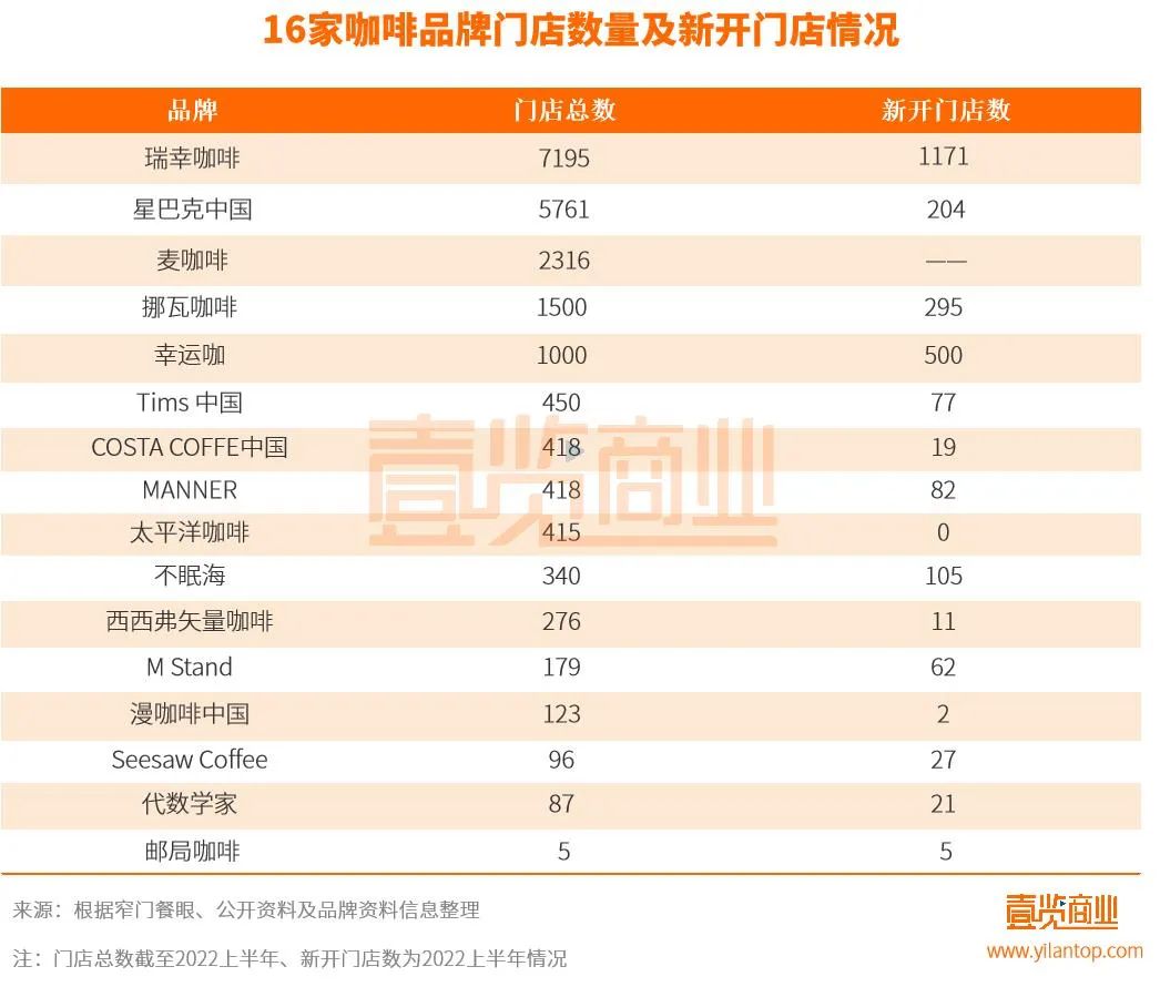 新開門店方面,今年上半年中,(除星巴克中國和瑞幸咖啡外)新開門店數(shù)量超100家的品牌有3家,為幸運咖、挪瓦咖啡和不眠海,分別新開門店500家、295家、105家。另外,MANNER、Tims中國和M Stand也保持著較快的擴張速度,同期分別新開門店82家、77家和62家。