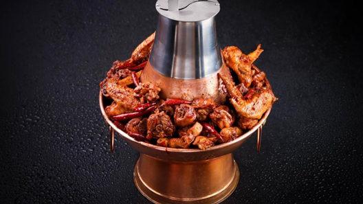 再來說說火鍋雞,起源于河北滄州,是一個(gè)有點(diǎn)“混搭”的品類:鍋具用的是老北京涮肉的銅鍋,做法則是將川菜中紅燒雞與麻辣火鍋結(jié)合創(chuàng)新而成。和地鍋雞一樣,都是以雞為主料,流程上也是先吃雞再涮菜。